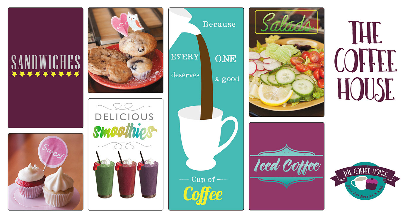 This commissioned project's objective was to photograph the Coffee House and Sweet Butter Cupcakes's food items, create a logo, and make window wraps to boost foot traffic into the cafe. I also created a mock-up for a postcard mailer and menu board.